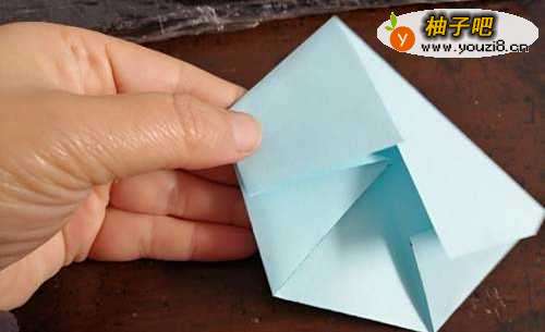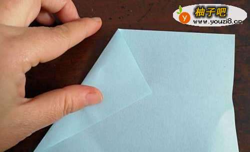 3打开彩纸,把右下角向内折,如图一。再把右上侧的边向内折,如图二。把左侧的角向着中间的点对折,如图三。