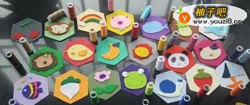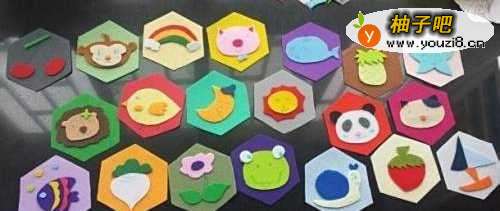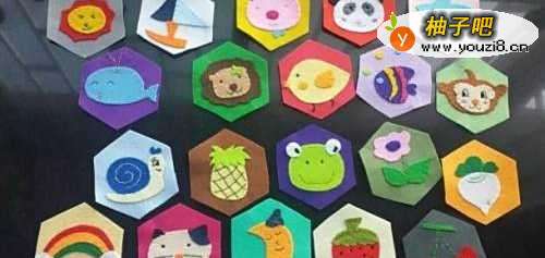 裁剪边长相等的正五边形12个,正六边形20个。之后宝马根据自己喜好,配上相应的图案,数字,字母等等。我的这个小球球大小和足球差不多,五边形和六边形都是4.5厘米。(五边形和六边形宝妈可以在网上搜索两种图形的折法,折好后,一剪刀就可以剪好了,在用尺子调整大小。剪图案时建议宝妈把载片平铺开,根基喜好和图案颜色进行统一搭配,这样可以协调整体的色调。)