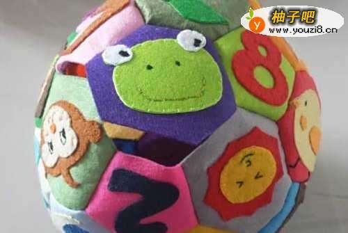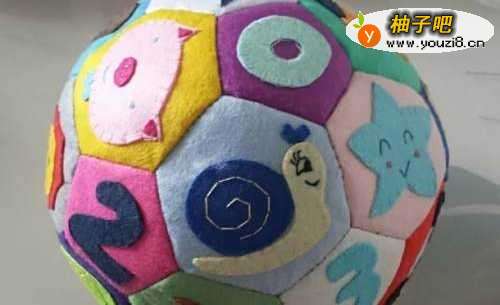 9填充,封口。 从翻口填入适量丝绵或者棉花,有响铃的宝妈也可以塞入响铃,翻口用藏针法缝好,宝宝的不织布球球就大功告成了。