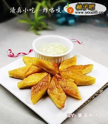 21 买的现成的咯吱皮。32 把大蒜剁成末备用。43 把咯吱皮切成菱形块。54 锅中注油,下入咯吱块。65 中火炸至,咯吱表面金黄,捞出沥油。76 蒜末中加入盐和适量的清水,搅拌均匀,用炸好的咯吱蘸食即可。
