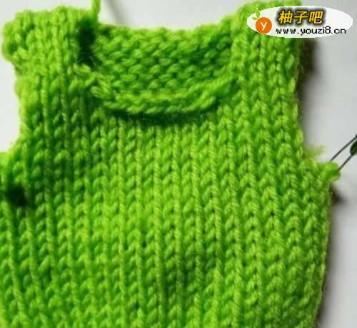 4然后翻过面来整理一下,开始领子部分;把领子挑起来织上下针,织到需要的高度收针,完成领子的编织。