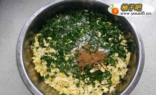 2将韭菜洗干净,沥干水分后,切成很碎的小丁放入盆中;把鸡蛋炒熟,然后冷却后,也切成很碎的小丁放入盆中;加入适量的盐、花椒面、味精后,搅拌均匀就可以了。