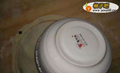 4把碗扣在韭菜盒子的边上慢慢的转一圈,顺着边缘把不整齐的地方切下来,这样看着就整齐多了,颜值瞬间提升。