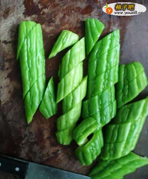 2五花肉切块状,凉瓜也切成块;姜蒜拍碎备用。