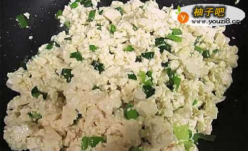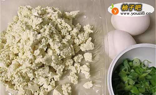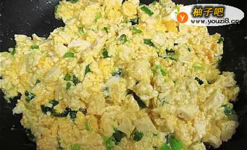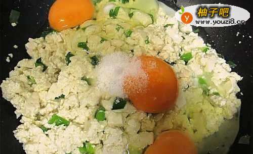 4鸡蛋直接打在豆腐上,加适量盐调味。