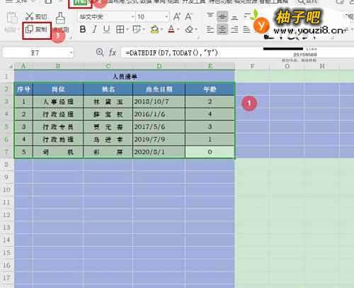 2选择数据表区域【A2:E7】,点击【开始】—【复制】;