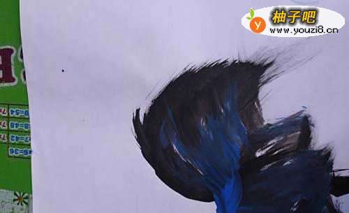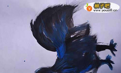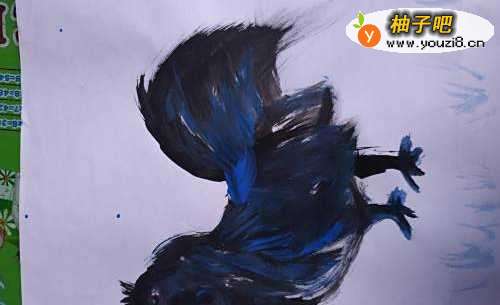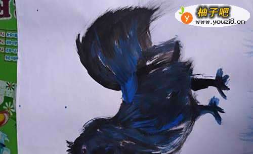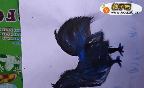 6用蓝色点缀乌鸡的头部和身上,脚上,尾巴上的羽毛和鸡冠,眼睛等。瞧,一只骄傲美丽可爱的乌鸡就画成了。宝宝可喜欢了。