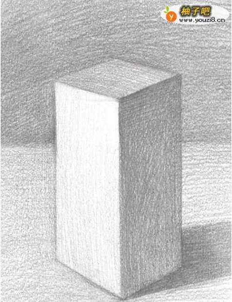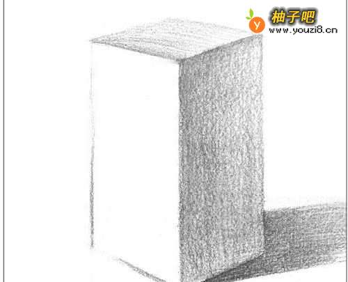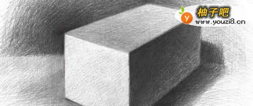 找到长方体的最大转折处,用软碳笔铺一层暗部和投影,好主意统一性,同时在分开投影和物体的区别,注意投影的前实后虚。