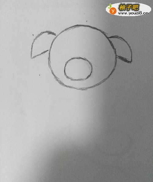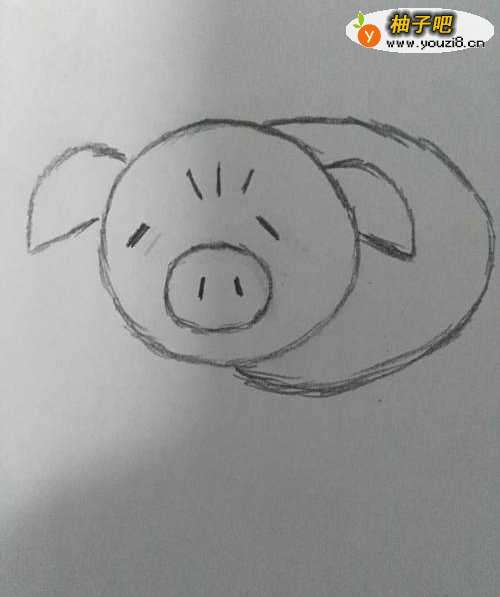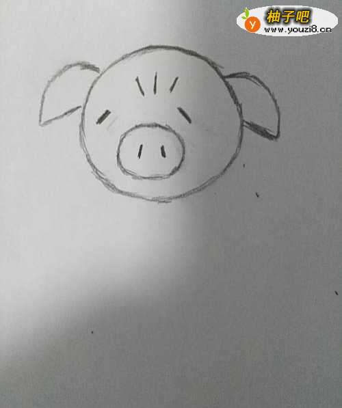 3在头部画上小猪的两只耳朵,注意一定要对称,而且小猪耳朵的底端是带点尖尖的,注意耳朵的轮廓。