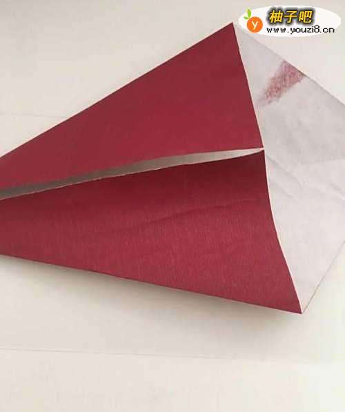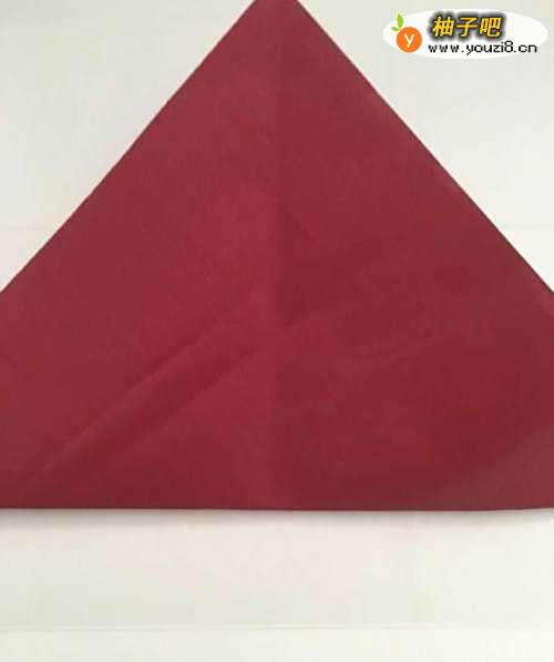 第一步 把一张22厘米X22厘米的正方形紫色彩纸 从下向上对角折叠