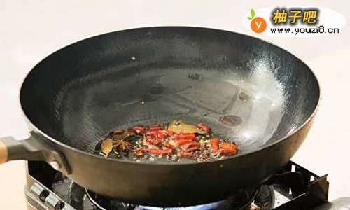 3炒锅中放油,烧热后转小火放入浸泡好的辣椒,煸炒出香味;