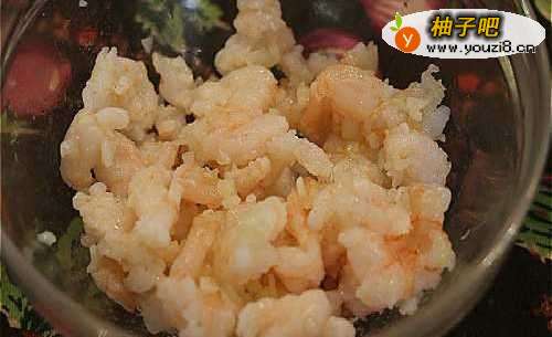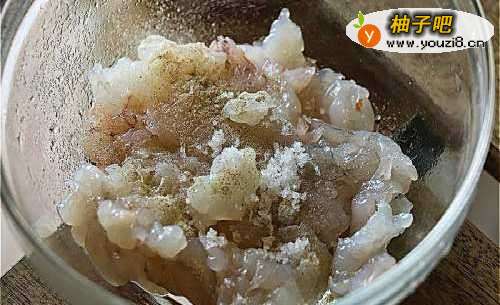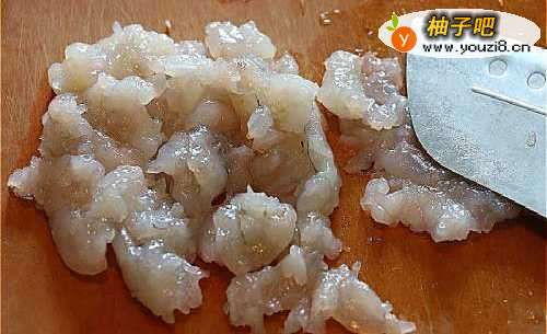 虾仁加入1茶匙盐抓匀,再用清水冲洗干净抹干水分后,用刀略拍扁。