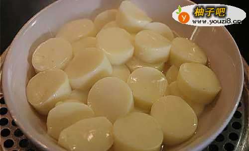 3日本豆腐切厚块,放于盘中,然后放入蒸锅中,大火蒸15分钟。