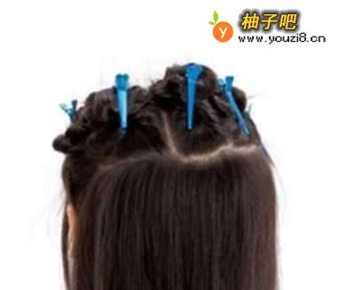 2然后将耳前两侧的发丝分离出来,并将上半部分的头发按图中进行固定好。