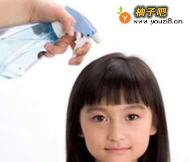 首先用铲宙梳子将小女孩的头发梳理好,然后用水将发丝喷湿,这样后面可以更好的扎发。
