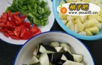 2将去皮的土豆、茄子带皮切滚刀块,切好的土豆用清水浸泡漂去淀粉。青红椒切三角形备用