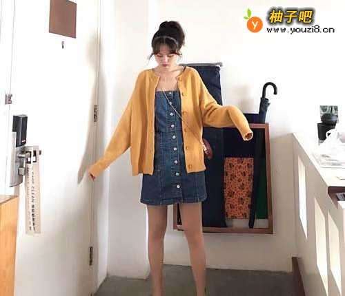 搭配二:黄色短款开衫毛衣黄色总是给人眼前一亮的感觉,这款黄色短款开衫毛衣保暖又靓丽,搭配一条牛仔吊带裙特别个性。