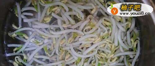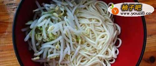 5锅中注水烧沸,分别将绿豆芽和挫肉馅放下去烫熟,然后捞出控水备用。