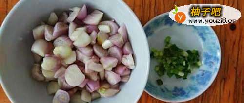 2红葱头剥皮去根切成小块,这个红葱头一定要用做卤肉饭的那种小小的红葱头,挫肉和豆芽不是油葱拌面必备的,但是这是让油葱拌面更好吃的一个秘密武器(因为生意好的小店都会放这个,嘿嘿~)