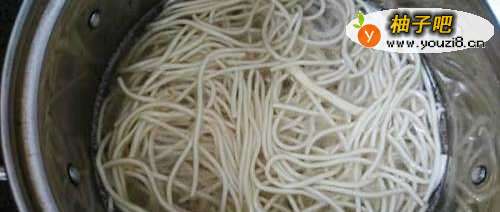 6另起锅将水烧沸后,放入碱水面煮开后捞出放在容器里。