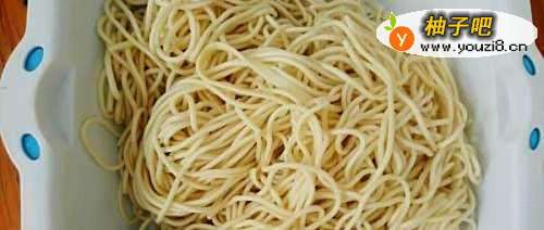 面条一般是用碱水面,我今天买的是煮熟的碱水面,只要在开水里烫一下就可以了,很方便。