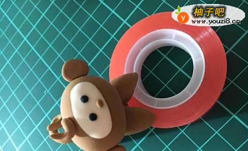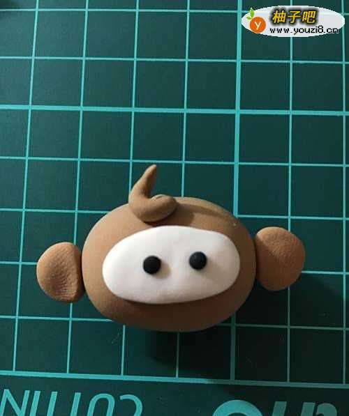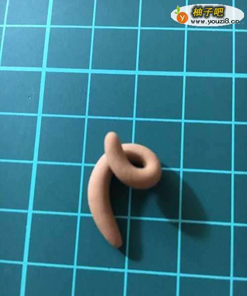 选取棕色的粘土搓成长条,卷起来,做猴子头上的装饰