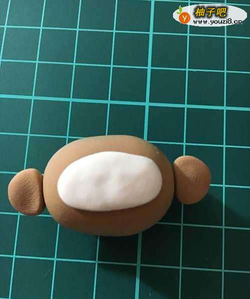 选取肉色的粘土,揉成小椭圆,压扁贴在棕色的头上。