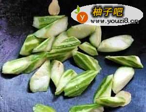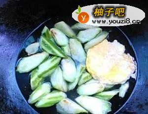 下切好的滚刀块的丝瓜,炒到边缘微焦,这样做会使汤很香。