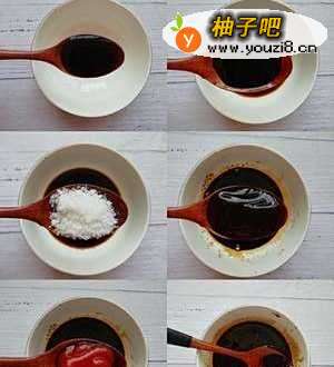 3调制酱汁:碗里放三勺生抽,两勺老抽,一勺白糖,一勺蚝油,一勺番茄酱,搅拌均匀备用。