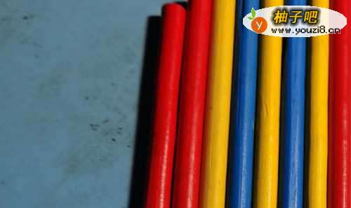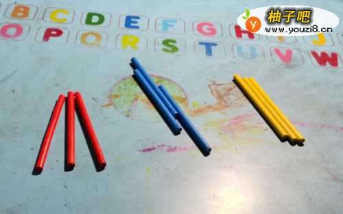 3让小朋友取出适量的木棍,让孩子把木棍摆开放在桌子上。再让孩子取出三个木棍,让孩子把这三个木棍分别摆开。