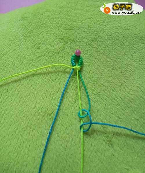 3从中心点移动一小段距离后的那一位置,就开始编金刚结。金刚结的编法就不多说了。金刚结所编的长度与珠子的直径几乎一样,珠子越大,所编的·金刚结就越长,,编到差不多长度的时候,可以与珠子比一下。如图四所示