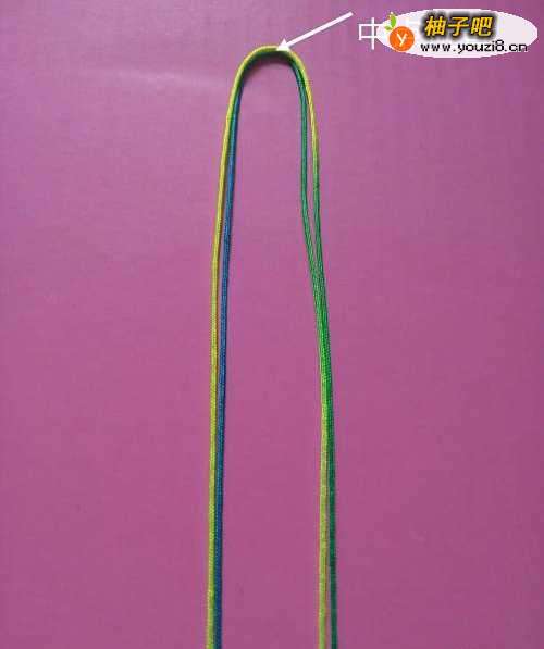 2我们先编眼扣,,将两根五彩线对折(目的是为了找到两根线的中心位置),找到中心位置后,向某一个方向(或左或右都行)移动一小段距离。