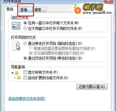 5在弹出的“文件夹选项”对话框里点击“查看”选项卡