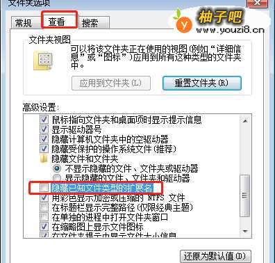 6在下面的“高级设置”里找到“隐藏已知文件类型的扩展名”,单击鼠标左键把它前面方框里的√去掉再点击确定按钮