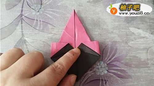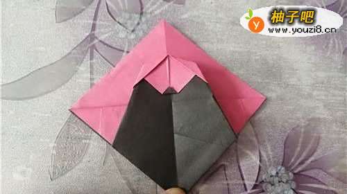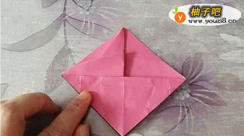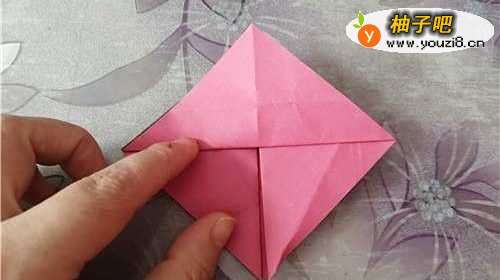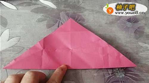 3把上面的角下折,如图一。把左侧的边向右折,如图二。再把彩纸翻到另一面,右侧的边向左折,两边是对称的,如图四。
