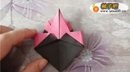 6我们把角的两侧,分别插进折纸里,如图一。再把其他的角分别向内折,如图二。最后,翻到正面用彩笔画上表情就完成了。