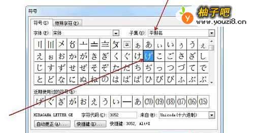 4在“子集”中选择“平假名”,并在下方选中平假名げ,点击“插入”。