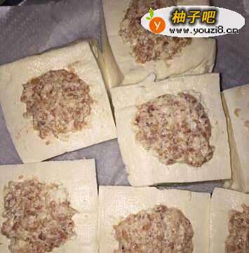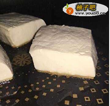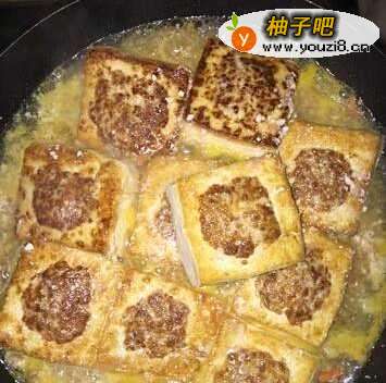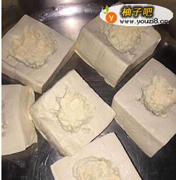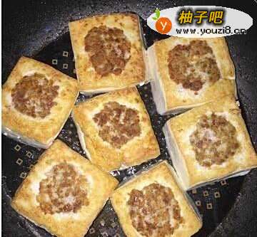 3将肉酿入豆腐里,肉不要突出豆腐太高,否则煎时肉和豆腐煎出来的颜色不一致。