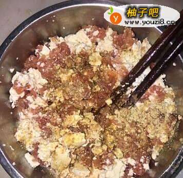2肉末用油、盐、胡椒粉、酱油、挖出的豆腐拌匀。