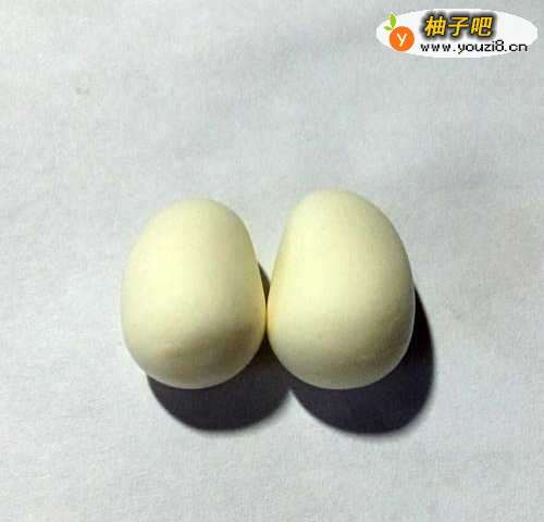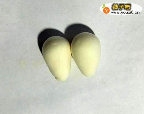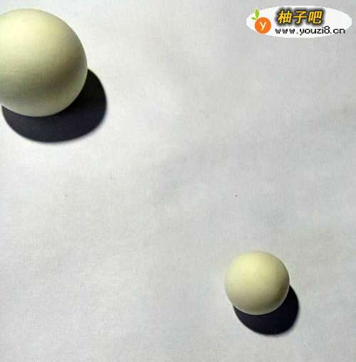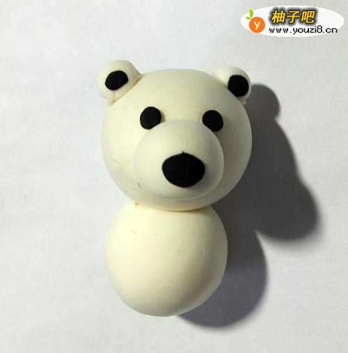 用白色彩泥揉成一大一小两个圆球,当做小熊的头和鼻子,并把它们粘合在一起。