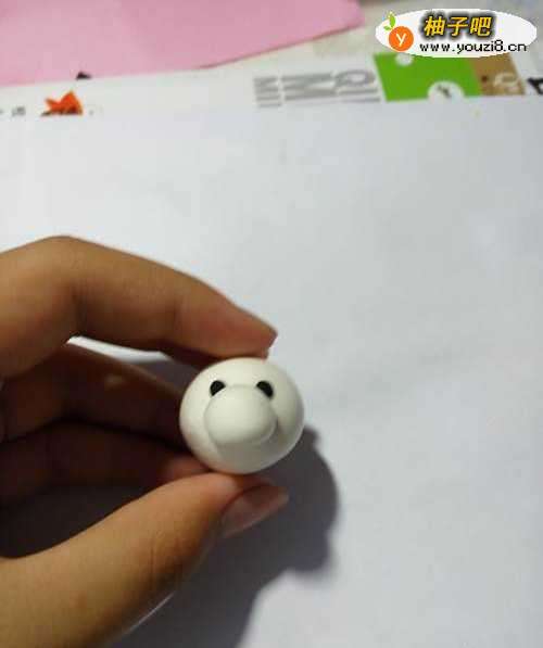 2用黑色彩泥做三个小圆,当做小熊的眼睛和鼻头,并粘在相应位置,如图所示。