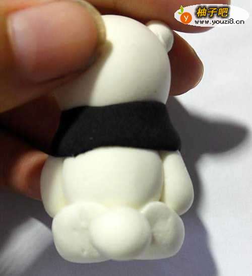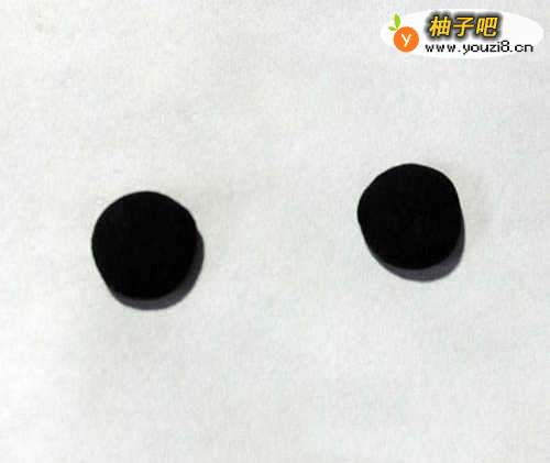7捏两个黑色小圆片,粘在小熊的脚底。