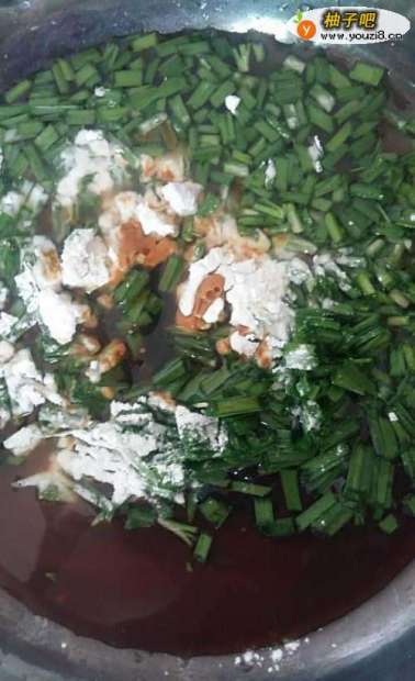 5五、将韭菜、水、、生粉还有酱油放在一个盘子里面进行搅拌,然后倒进豆腐里面搅均匀了。再等几分钟就可以出锅了。