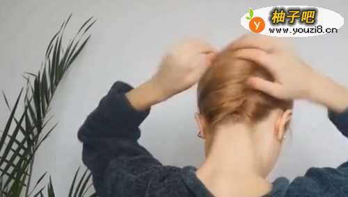 3捋起左边头发覆盖住右边的碎发和顶部扎起来的发梢扭转下将余下的发梢塞入左边扭转的头发里