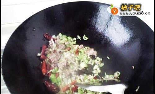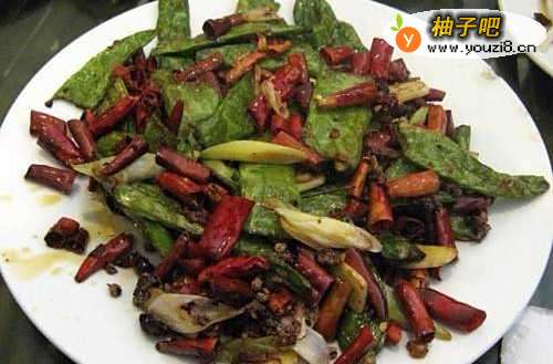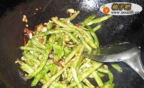 33、将芸豆放入热油锅内过油捞出;锅内留少许油,下肉末煸炒,放入虾米、冬菜、姜末和芸豆,中火干煸片刻,加高汤,收干汤汁,加调料,淋麻油,撒葱花,装盘即可。也可放入剁碎的辣椒