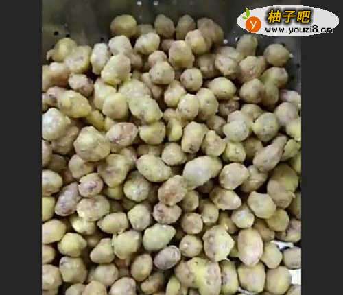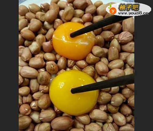 准备花生,打入两个鸡蛋黄,搅拌均匀。再加入两勺淀粉,翻裹均匀,漏掉多余的淀粉。
