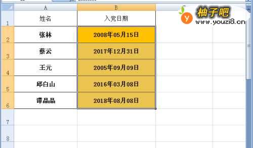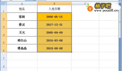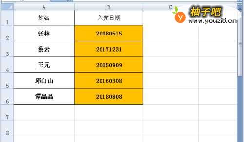 在使用EXCEL办公中,经常需要输入日期,但有的时候日期是从其它地方拷过来的,比如以下文件中,橙色部分的入党日期是文本格式,需要转换为日期格式。怎么进行呢?