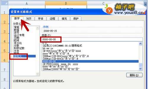 2在”设置单元格格式“中选择“数字”项,点击“自定义“,在”类型“中输入”0000-00-00“。