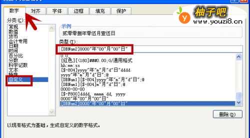 4若想将日期全部转换成大写,怎么办呢?在“类型”中输入“[DBNum2]0000"年"00"月"00"日"。