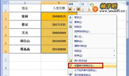 选中需B2至B6单元格,右击鼠标,在弹出的对话框中选择”设置单元格格式“。